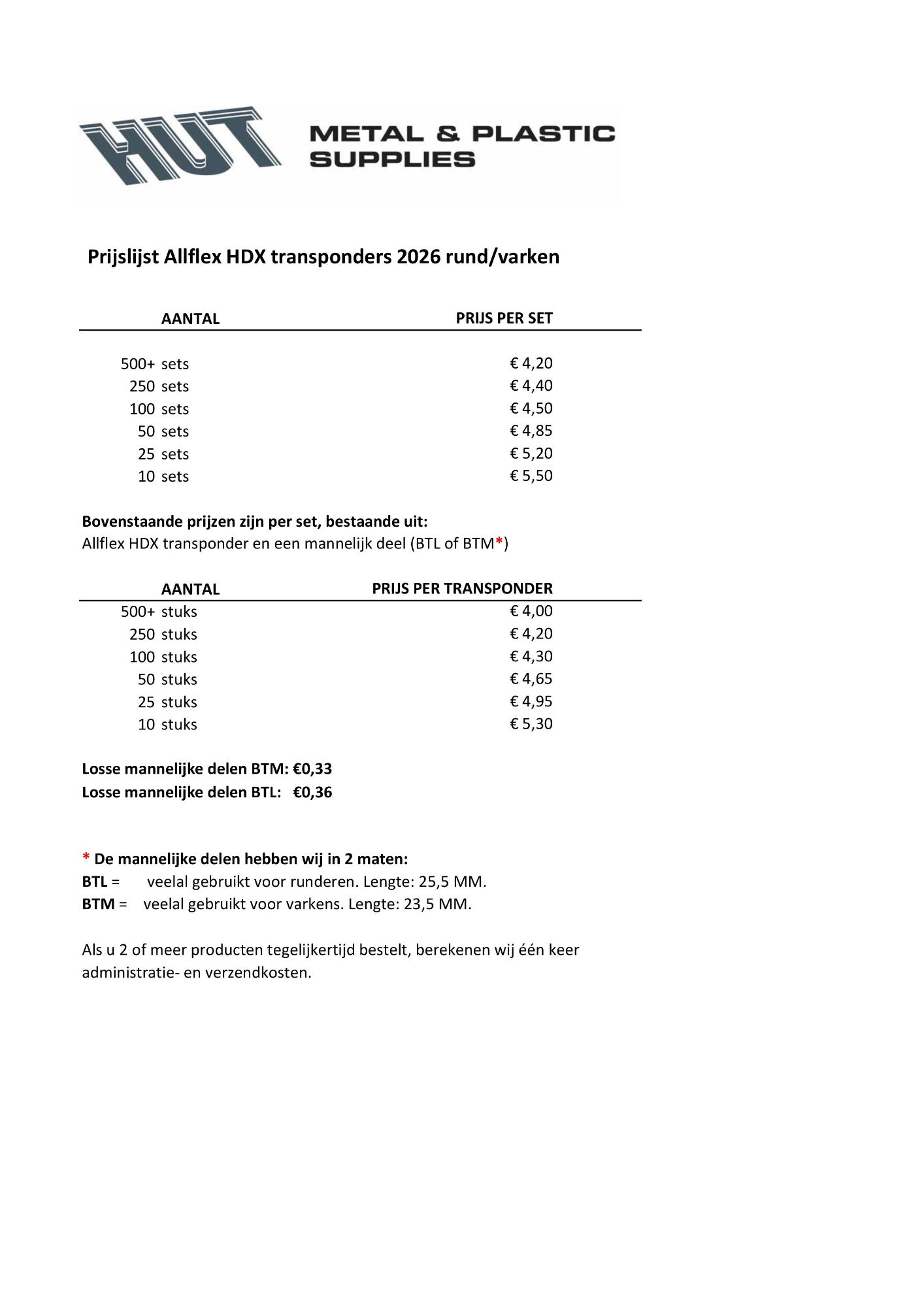 Hier vindt u onze prijslijst voor de Allflex HDX transponders met open kapje.